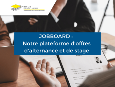 Un jobboard est une plateforme d’offres d’emploi en ligne. Selon votre profil, apprenant ou recruteur, vous pouvez accéder à des offres d’alternance ou de stage en bâtiment, ou en déposer. BTP CFA Pays de la Loire vous propose cet outil gratuitement sur son site internet.